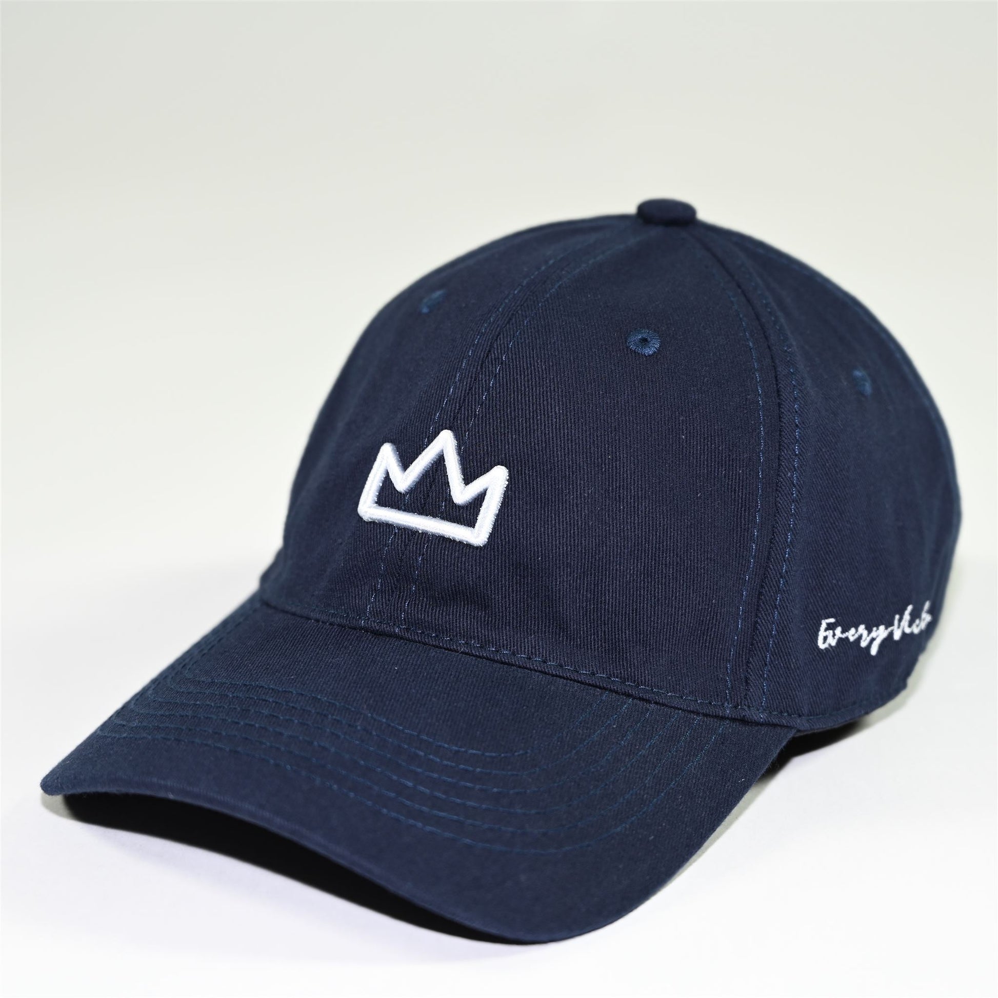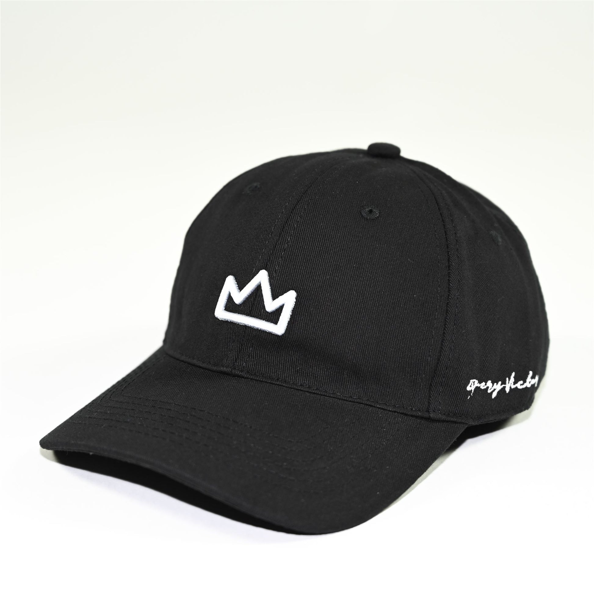 The Victor's Crown Dad Hat by Every Victory features an iconic embroidery patch logo on the front and on the side, and an adjustable metal buckle strap.
